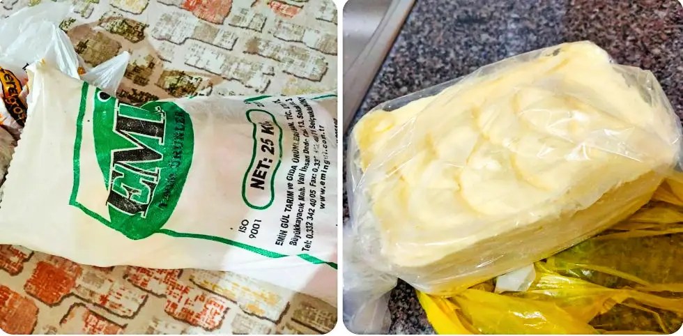 Pulang dari rumah anne, suami bawa sekarung bahan makanan. Ada kentang setengah karung, mentega, kacang kacangan, manti, pekmez, keju dan juga daging sapi beku. Alhamdulilah, ditengah situasi ekonomi yang sedang sulit, banyak harga bahan pokok naik, lalu Anne dengan ‘kantong ajaib’nya memberi sekarung kebutuhan untuk Ramadan, Saya tulis ‘kantong ajaib’ karena beliau memang punya gudang khusus untuk menyimpan stok bahan makanan hasil dari kebun sendiri. kalau untuk hasil ternak, susu sapi segar diolah jadi keju , mentega, yoghurt. Setiap pagi selalu mengambil telur dari kandang ayam. Ketahanan pangan warga desa memang terbaik dalam mensiasati kondisi ekonomi saat ini. Kiriman Persiapan Ramadan diberi Anne, Semoga menjadi keberkahan dan pahala buat tangan beliau yang mengolah ini semua.