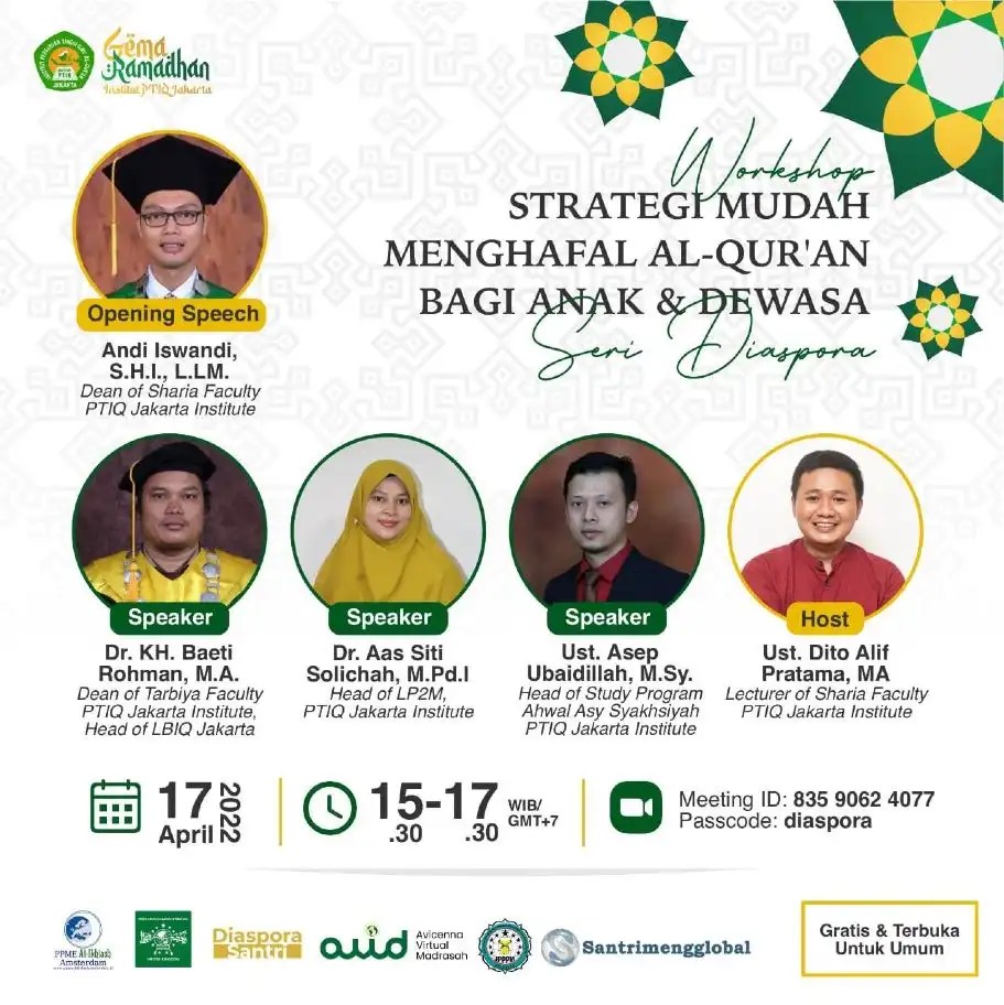 Ahad, 17 April 2022 PTİQ Jakarta menyelenggarakan workshop Ramadan (gema Ramadan) dengan tema: Workshop strategi mudah menghafal alquran bagi anak dan dewasa seri Diaspora. Workshop diselenggarakan via Zoom dan terbuka untuk umum. Undangan workshop ini saya dapatkan dari grup WA Fatayat-Muslimat Eropa, meski silent readers:) saya tertarik untuk ikut workshop gratisan dan penuh ilmu dari para pendidik, Tahfidz PTİQ Jakarta. Beberapa materi selama Workshop saya rangkum dalam tulisan diBlog ini, semoga bisa bermanfaat untuk para pengunjung blog:)