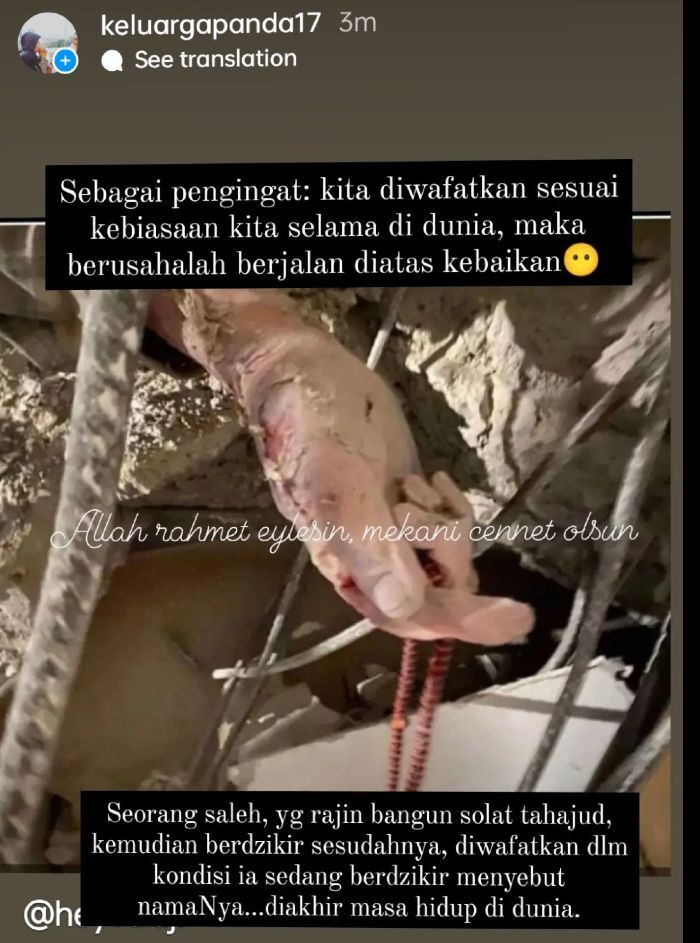 Ada seorang pria 140 jam terjebak reruntuhan, dia bertahan dengan cara terus membaca alquran yang dihafalnya sampai pertolongan itu datang, ketika tim penyelamat menolongnya , dia terus melantunkan ayat ayat suci alquran, videonya viral, tidak hanya satu orang, ada korban yang juga melakukan hal sama, bahkan tidak berhenti melantunkan ayat ayat alquran selama di dalam ambulan menuju rumah sakit.