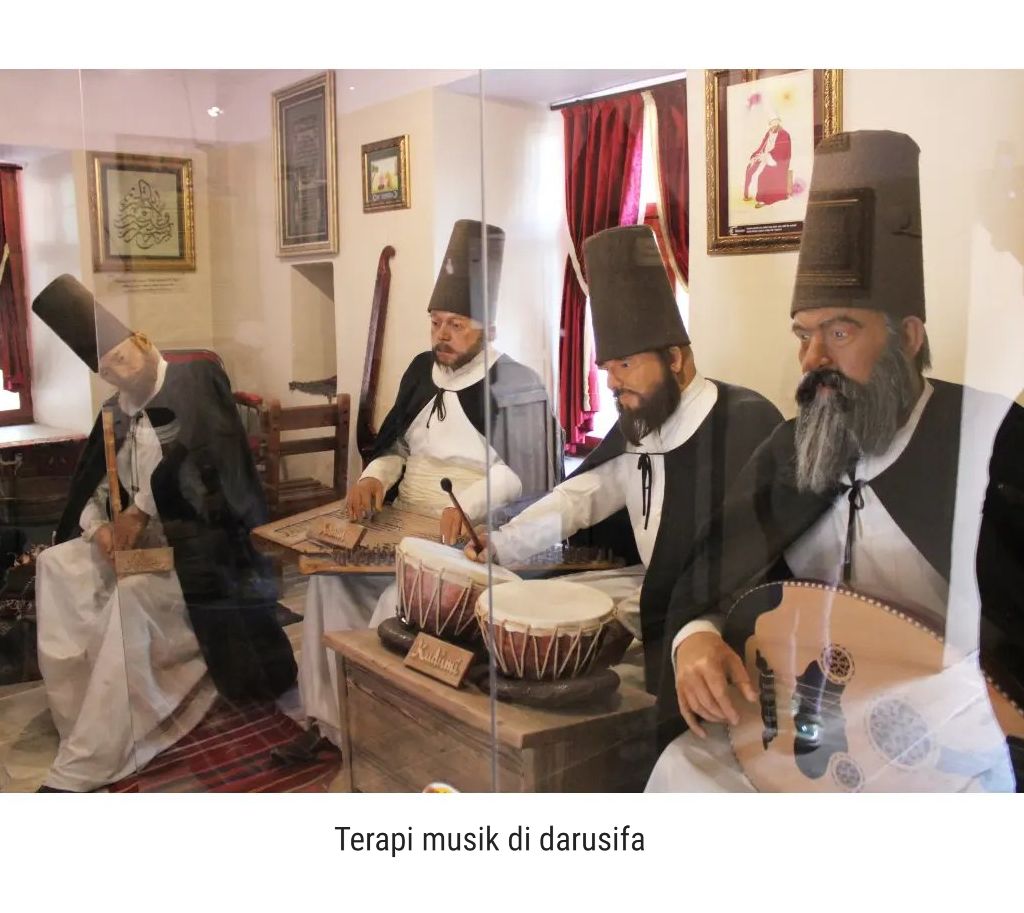 Banyak hal menarik di museum rumah sakit ini, salah satunya terapi musik yang dilakukan untuk pasien kesehatan mental, di era ottoman, sudah diperkenalkan terapi musik untuk para pasien gangguan jiwa, ada para terapis dan pemain musik yang akan melakukan sesi terapi untuk pasien, mereka memainkan musik dihadapan pasien.